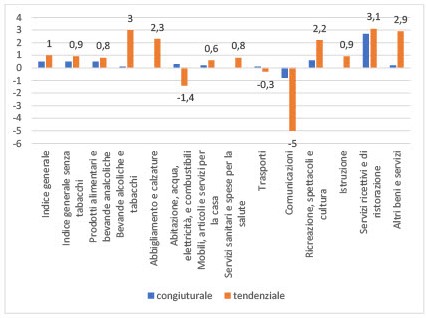 Cultura: Si registra un aumento dei prezzi dei giornali, sia quelli a diffusione nazionale (+2,5%; +6,8% il tendenziale) sia quelli a diffusione locale (+2,9%; +3,3% il tendenziale), a fronte di una diminuzione dei periodici (-1,2%; +1,4% il tendenziale). Le variazioni dei prezzi dei giornali sono riconducibili ad incrementi effettivi di prezzo da parte di alcune importanti testate, sia nazionali che locali, oltre che alla rimodulazione dell’offerta per un abbonamento digitale nazionale e ad una diversa distribuzione degli allegati. Per quanto riguarda i periodici, la variazione rilevata è da attribuirsi ad una differente offerta di allegati e a prezzi speciali più bassi di alcune riviste rispetto al prezzo abituale di vendita.