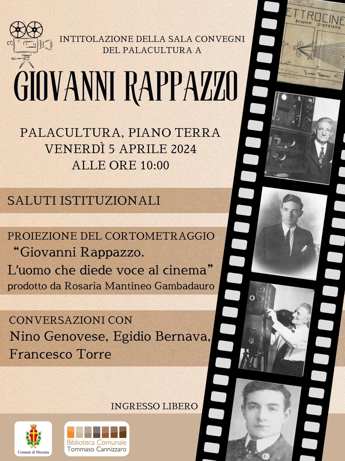 In occasione dell'intitolazione della sala "G. Rappazzo", grazie alla gentile concessione di Rosaria Mantineo Gambadauro e della nipote Giacoma Rappazzo che hanno fatto dono della targa, l'Amministrazione comunale organizza un momento di riflessione e di ricordo dedicato all'inventore messinese Giovanni Rappazzo (Messina, 16 ottobre 1893 – Messina, 3 aprile 1995), che ha avuto l'intuizione di realizzare il cinema sonoro. L'appuntamento, presente l'assessore alle Politiche culturali Enzo Caruso, anche in rappresentanza del sindaco Federico Basile, è previsto venerdì 5 aprile, alle ore 10.30, presso il foyer del Palacultura Antonello. Nel corso dell'evento sarà possibile assistere alla proiezione del cortometraggio “Giovanni Rappazzo. L’uomo che diede voce al cinema”, prodotto da Rosaria Mantineo Gambadauro e a lui dedicato; nell'occasione interverranno esperti del settore per conversare sul tema e riscoprire l'illustre messinese. Nel 1921, poco dopo la grande guerra, Rappazzo depositò il brevetto per la pellicola a impressione contemporanea di immagine e suoni, ma non riuscì a vendere la sua invenzione, né a trovare finanziatori, finendo poi per essere sfruttata dall’industria cinematografica americana.