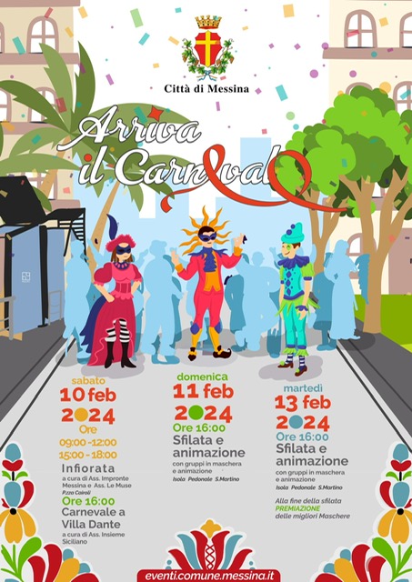 La tre giorni inizierà sabato 10 febbraio, dalle ore 9 alle 12.30 e dalle 15 alle 18, a piazza Cairoli, con un’infiorata che abbellirà la piazza cittadina, curata dalle associazioni Impronte Messina e Le Muse di Reggio Calabria; e alle 16 l’appuntamento Carnevale a villa Dante, a cura dell'associazione Insieme Siciliano, con momenti di giochi, sfilate e premiazione delle mascherine.