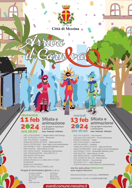 “Appuntamenti organizzati per festeggiare il Carnevale in maniera allegra e partecipata – ha dichiarato l’assessore Caruso - per stupire i più piccoli e favorire l’aggregazione di famiglie e bambini del territorio. È nostro intendimento mantenere vive le tradizioni del Carnevale con il duplice obiettivo di farlo scoprire alle giovani generazioni e, al contempo, per far vivere questa esperienza, che animerà la città, ai messinesi e non. Oltre alle associazioni, ringraziamo le società partecipate, le scuole e tutti coloro che hanno collaborato all’organizzazione degli eventi. Sperimentiamo in questa edizione un percorso a cui vorremmo dare continuità alla ricerca di un elemento caratterizzante per distinguerlo da altre città. Purtroppo, per motivi istituzionali, non è presente qui con noi l’assessora Cannata, che è parte attiva nel programma di ‘Arriva il Carnevale 2024’”.