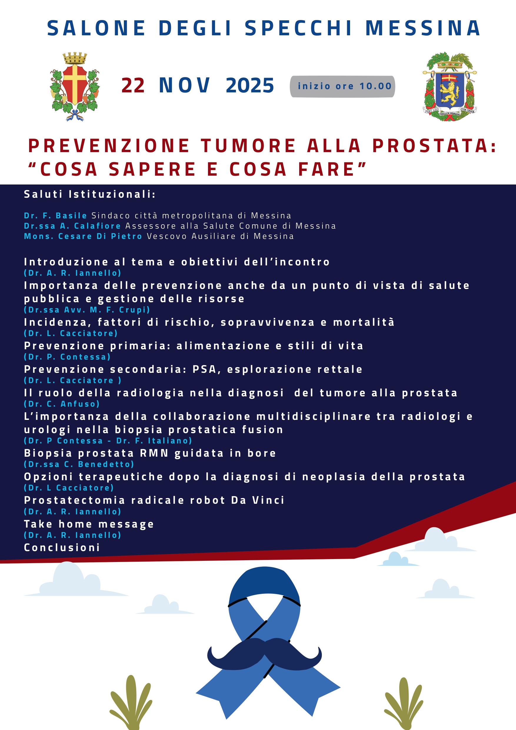 Domani, sabato 22 novembre, nel Salone degli Specchi della Città Metropolitana di Messina, dalle ore 10, si terrà il Convegno dal tema "Prevenzione tumore alla prostata: cosa sapere e cosa fare". Il Sindaco Federico Basile, l'Assessora alla Salute Alessandra Calafiore e il Vescovo ausiliare di Messina Cesare Di Pietro porteranno ai presenti il saluto istituzionale. Il dott. Antonio Iannello introdurrà l'evento, patrocinato dal Comune di Messina e dalla Città Metropolitana di Messina, e gli obiettivi dell'incontro. A seguire gli interventi della dott.ssa Maria Felicita Crupi, direttore amministrativo IRCCS Bonino-Pulejo, su "Importanza della prevenzione anche da un punto di vista di salute pubblica e gestione delle risorse"; del dott. Loris Cacciatore su "Incidenza, fattori di rischio, sopravvivenza e mortalità"; del dott. Pier Angelo Contessa su "Prevenzione primaria: alimentazione e stili di vita"; del dott. Loris Cacciatore su "Prevenzione secondaria: PSA, esplorazione rettale"; del dott. Carmelo Anfuso su "Il ruolo della radiologia nella diagnosi del tumore alla prostata"; dei dottori Pier Angelo Contessa e Fabio Italiano su "L'importanza della collaborazione multidisciplinare tra radiologi e urologi nella biopsia prostatica fusion"; della dott.ssa Caterina Benedetto su "Biopsia prostata RMN guidata in bore"; del dott. Loris Cacciatore su "Opzioni terapeutiche dopo la diagnosi di neoplasia della prostata"; e del dott. Antonio Iannello su "Prostatectomia radicale robot Da Vinci" e su "Take home message", prima delle conclusioni.