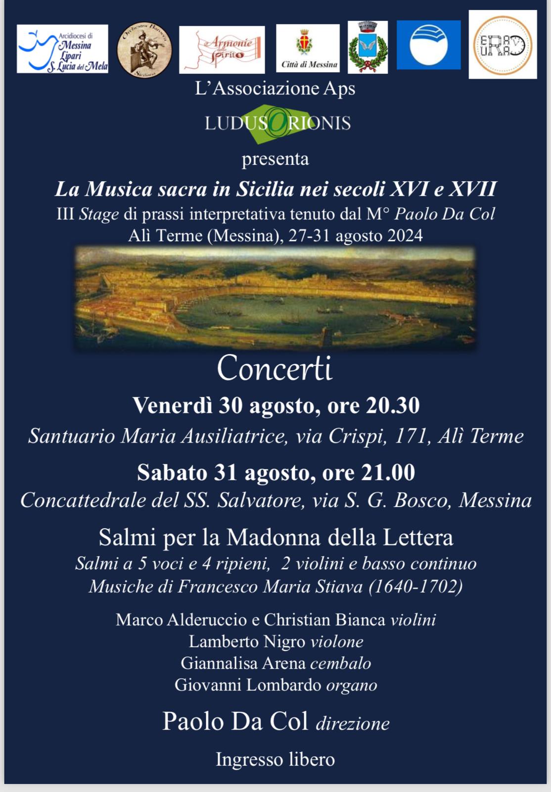 Patrocinato dal comune di Messina, domani, sabato 31 agosto, alle ore 21, si terrà presso la Concattedrale del SS. Salvatore, in via S. G. Bosco a Messina, il concerto "Salmi per la Madonna della Lettera", organizzato dall'associazione Aps Ludus Orionis, nell'ambito della musica sacra in Sicilia nel secoli XVI e XVII - III stage di prassi interpretativa. Si tratta di salmi a 5 voci e 4 ripieni, due violini e basso continuo; musiche di Francesco Maria Stiava (1640-1702), Marco Alderuccio e Christian Bianca violini, Lamberto Nigro violone, Giannalisa Arena cembalo e Giovanni Lombardo organo; direzione di Paolo Da Col. L'ingresso sarà libero.