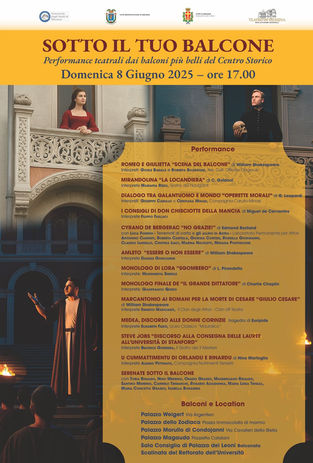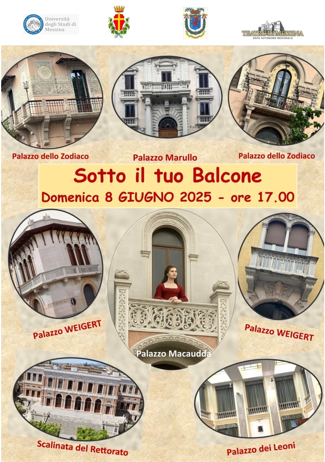 L’iniziativa, promossa dall’Assessorato alle Politiche Culturali, in collaborazione con l’Università degli Studi di Messina, la Città metropolitana di Messina e il Teatro Vittorio Emanuele, si svolgerà nel centro storico. A fare da cornice saranno i suggestivi balconi in stile eclettico e tardo-liberty, simboli della ricostruzione post-terremoto, e le piazze storiche di Messina, animate da un percorso itinerante con monologhi di autori classici e contemporanei, serenate sotto i balconi e rievocazioni storiche.