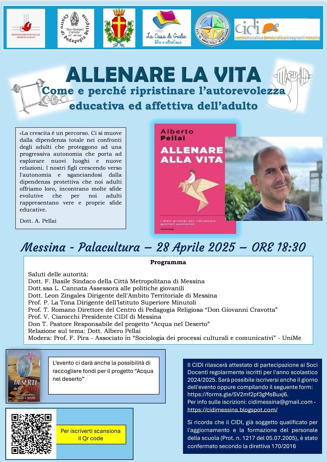 Lunedì 28 aprile, alle ore 18.30, presso il Palacultura "Antonello da Messina", si terrà l’incontro pubblico dal titolo “Allenare alla vita. Come e perché ripristinare l’autorevolezza educativa ed affettiva dell’adulto”, ispirato al libro “Allenare alla vita. I 10 principi per ritornare ad essere genitori autorevoli” (Mondadori ed.). Il dott. Pellai guiderà la riflessione della città sull’urgenza di recuperare il ruolo educativo dell’adulto in una società sempre più segnata da fragilità relazionali, smarrimenti identitari e disorientamento affettivo. Sarà un’occasione per ascoltare, comprendere, condividere strumenti concreti e chiavi di lettura che aiutino famiglie, insegnanti, educatori e professionisti a fronteggiare le sfide della crescita in un tempo complesso.
