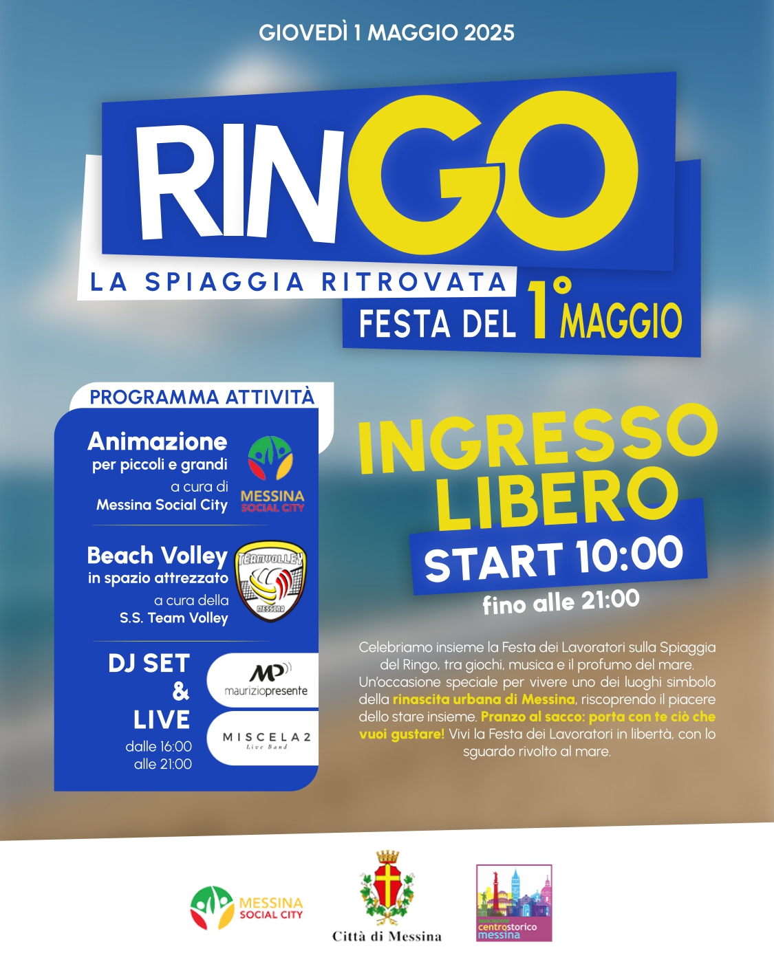 L’Amministrazione comunale ha, infatti, deciso di organizzare in compartecipazione con l’Associazione Centro Storico un’iniziativa che intende offrire ai cittadini l’opportunità di celebrare insieme il Primo Maggio, Festa dei Lavoratori, proprio nella spiaggia del Ringo.