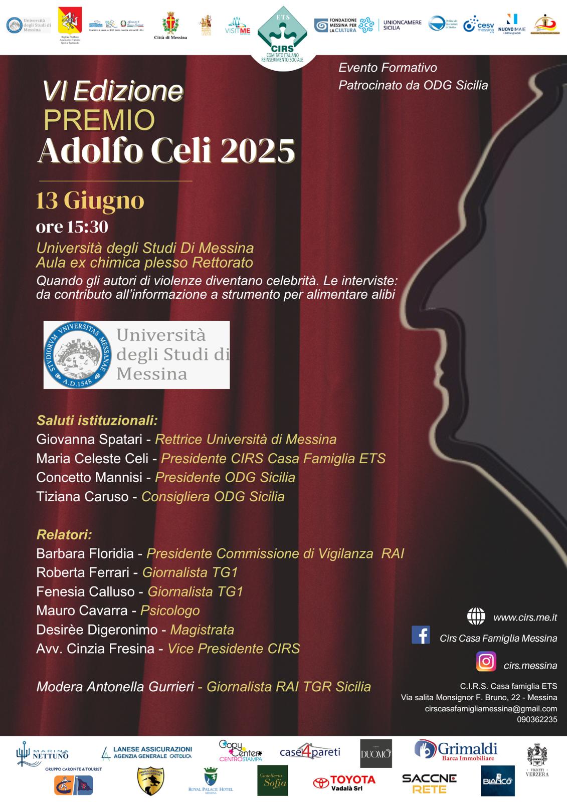 Si accendono i riflettori sulla VI edizione del Premio Adolfo Celi, evento promosso e organizzato dal Cirs casa-famiglia ETS, in compartecipazione con il Comune di Messina e la fondazione Messina per la Cultura e con il patrocinio dell’Assessorato regionale al Turismo, del Nuovo IMAIE, di Unioncamere Sicilia, dell’Ordine dei Giornalisti di Sicilia, dell’Università di Messina e del Cesv di Messina.