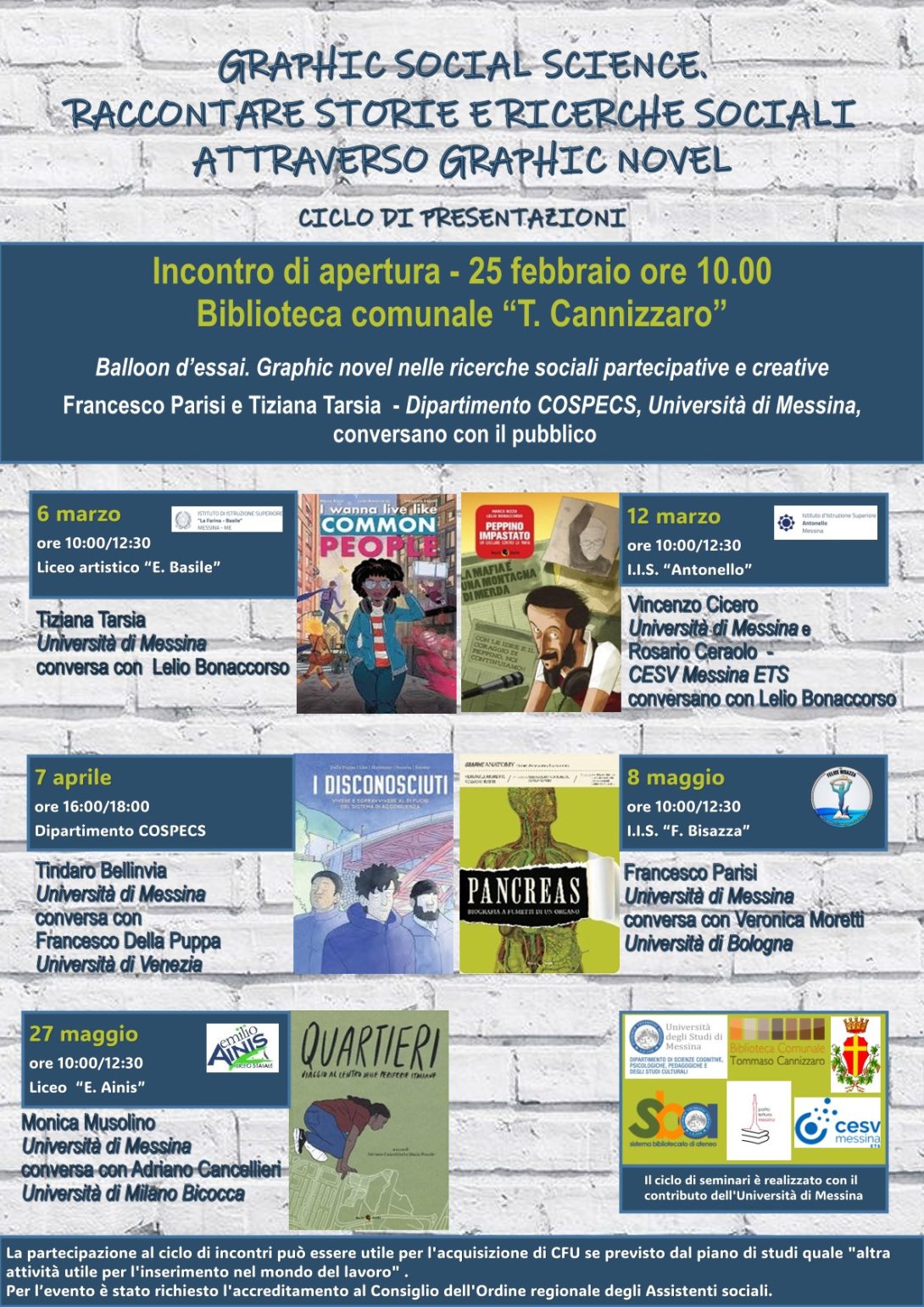 Le presentazioni saranno delle conversazioni tra ricercatori, esperti, autori e fumettisti. Saranno presenti, per il dipartimento Cospecs, Tiziana Tarsia, Tindaro Bellinvia, Vincenzo Cicero e Francesco Parisi, il fumettista Lelio Bonaccorso, Adriano Cancellieri dell'Università di Milano-Bicocca, l'esperto di terzo settore Rosario Ceraolo, Monica Musolino del dipartimento Scienze politiche e giuridiche, Francesco Della Puppa dell'Università di Venezia e Veronica Moretti dell'Università di Bologna). L'incontro è libero e gratuito.