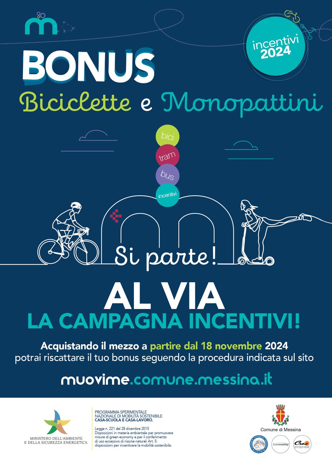 A partire da lunedì 18 novembre, i cittadini potranno usufruire degli incentivi per l’acquisto di biciclette e monopattini al fine di muoversi in libertà senza l’ausilio di autovetture fino ad un massimo del 50 per cento del costo sostenuto per l'acquisto con il limite di 565 euro per le biciclette e 255 per i monopattini. Gli interessati dovranno verificare se il proprio ente o azienda abbia aderito al programma sperimentale, andando nella home page e cliccando su enti convenzionati. Occorre registrarsi, se non lo si é già fatto, sul sito https://muovime.comune.messina.it seguendo le istruzioni. Si dovrà scaricare l'avviso pubblico e acquistare la bici o il monopattino, avendo cura di acquisire dal venditore i documenti indicati nell'avviso, a seguire accedere alla piattaforma e a partire dal 1 dicembre inserire la documentazione richiesta necessaria per il rimborso. Le risorse necessarie destinate ad incentivi per i cittadini sono state calcolate fino ad un massimo di 1.100 cittadini (300 potranno acquistare monopattini e circa 800 biciclette) fino ad esaurimento dei posti.