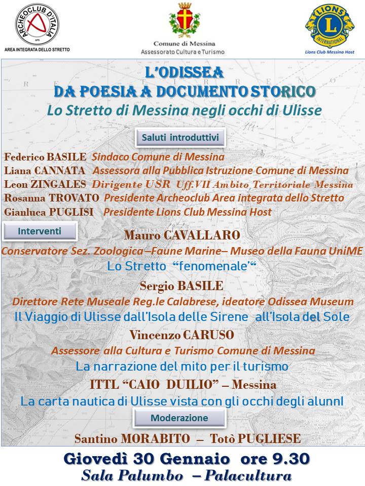 Si è tenuto al Palacultura Antonello, presente l'assessore alle Politiche culturali e al Turismo Enzo Caruso, anche in rappresentanza del sindaco Federico Basile, un incontro rivolto agli studenti dei licei messinesi dal tema "L'Odissea da poesia a documento storico. Lo Stretto di Messina negli occhi di Ulisse", promosso dall'assessorato alla Cultura e al Turismo, in collaborazione con Archeoclub Area Integrata dello Stretto e Lions Club Messina Host. Obiettivo del progetto, avviato lo scorso 16 gennaio, è valorizzare un ambito territoriale in chiave turistica, ripartendo proprio dall'Odissea, il poema epico più famoso di tutti i tempi, che vede nelle regioni dello Stretto il suo teatro naturale.
