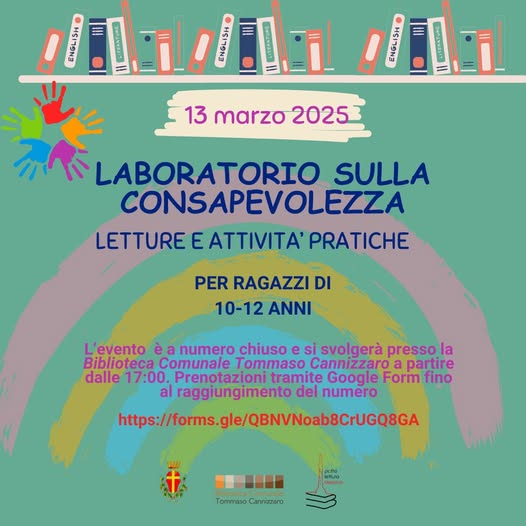 Giovedì 13 marzo, a partire dalle ore 17, si svolgerà alla biblioteca comunale "Cannizzaro" del Palacultura Antonello un "Laboratorio sulla Consapevolezza", dedicato a ragazze e ragazzi, dai 10 ai 12 anni. Partendo dalla lettura ad alta voce di alcuni albi illustrati o racconti brevi, si proseguirà con un breve percorso sulla conoscenza di sè, sulla consapevolezza delle proprie potenzialità e sull'esplorazione di nuove opportunità e diversi punti di vista attraverso attività pratiche e giochi. Il laboratorio è gratuito con prenotazione obbligatoria al seguente link https://forms.gle/QBNVNoab8CrUGQ8GA . Le prenotazioni, con un numero massimo di quindici partecipanti, si accettano fino ad esaurimento dei posti disponibili.