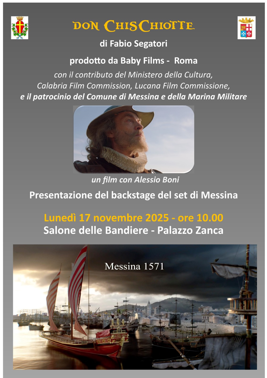 Lunedì 17 novembre, alle ore 10, nel Salone delle Bandiere a Palazzo Zanca, alla presenza del Sindaco Federico Basile e dell’Assessore alle Politiche Culturali e al Turismo Enzo Caruso, sarà presentato in anteprima assoluta il backstage delle riprese messinesi del film "DON CHISCIOTTE", girato da Fabio Segatori, che sarà proiettato nelle sale nel 2026.