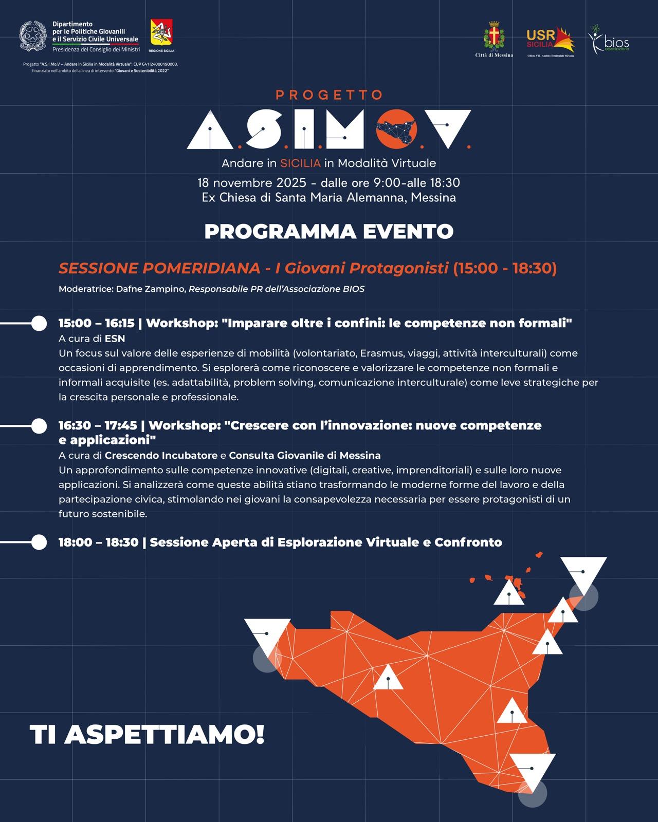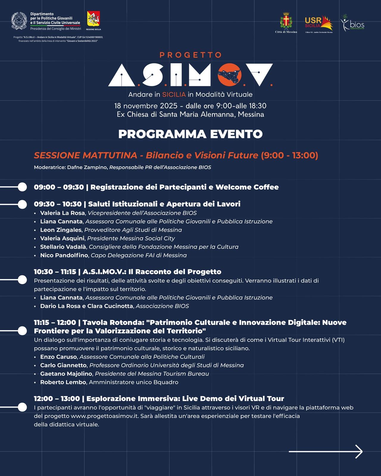 Martedì 18 novembre, dalle ore 9 alle 18.30, presso i locali di Santa Maria Alemanna, si terrà l’evento finale del progetto "A.S.I.MO.V. – Andare in Sicilia in Modalità Virtuale”, promosso dall’Associazione BIOS e dall’Assessorato alle Politiche Giovanili e Pubblica Istruzione, con il contributo del Provveditorato agli Studi di Messina e finanziato dalla Regione Siciliana e dalla Presidenza del Consiglio dei Ministri – Dipartimento per le Politiche Giovanili e il Servizio Civile Universale.