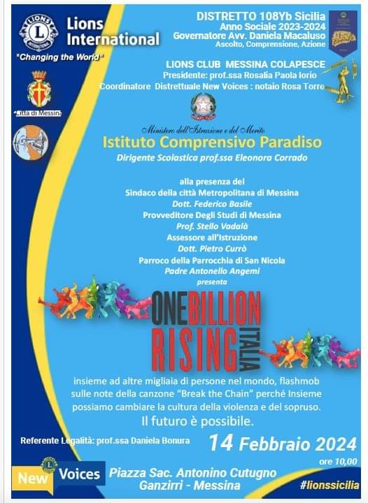 L’assessore alle Politiche Scolastiche Pietro Currò, anche in rappresentanza del sindaco Federico Basile, ha partecipato stamani nella piazza Sacerdote Antonino Cutugno, antistante la chiesa di Ganzirri, all’evento di carattere nazionale “One Billion Rising Italia”, organizzato dall’Istituto Comprensivo Paradiso, diretto dalla prof.ssa Eleonora Corrado, e dal Lions club Messina Colapesce, presieduto dalla prof.ssa Rosalia Paola Iorio. La manifestazione è stata un flashmob contro la violenza di genere sule note della canzone “Break the Chain”. Vi hanno preso parte il capo di gabinetto della Prefettura di Messina Michela Fabio; il presidente della VI Circoscrizione Francesco Pagano, insieme al consigliere Giovanni Donato; il coordinatore distrettuale dei Lions Rosa Torre; la referente del progetto legalità Daniela Bonura; e gli alunni della scuola secondaria di primo grado plessi Petrarca e Pietro Donato, coordinati dai rispettivi docenti.