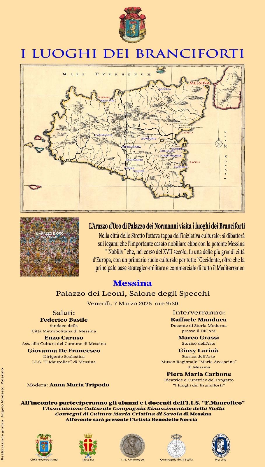 Domani, venerdì 7 marzo, alle ore 9.30, presso il salone degli Specchi di palazzo dei Leoni, si terrà l'evento "I luoghi dei Branciforti", patrocinato dal comune di Messina. Il sindaco della Città metropolitana di Messina Federico Basile porgerà il saluto istituzionale, insieme all'assessore alle Politiche culturali Enzo Caruso e alla dirigente scolastica dell'I.I.S. Maurolico Giovanna De Francesco. Interverranno Raffaele Manduca, docente di storia moderna presso il DICAM; Marco Grassi, storico dell'arte; Giusy Larina, storica dell'arte al museo regionale "Maria Accascina" di Messina; e Piera Maria Carbone, ideatrice e curatrice del progetto "I luoghi dei Branciforti". All'incontro, moderato da Anna Maria Tripodo, parteciperanno gli alunni e i docenti dell'Istituto Maurolico, l'associazione culturale Compagnia rinascimentale della Stella, Convegni di cultura Maria Cristina di Savoia di Messina e l'artista Benedetto Norcia. A Messina si svolge l'ottava tappa di questo progetto itinerante, che, coinvolgendo istituzioni, scolaresche, studiosi, associazioni culturali e artisti, intende mettere in risalto i legami del prestigioso casato con la Messina "nobilis" del XVII secolo, che fu una delle più grandi città d'Europa con un ruolo primario culturale per tutto l'Occidente, oltre che la principale base strategico-militare e commerciale di tutto il Mediterraneo. L'iniziativa è un contributo alla diffusione della cultura del passato come strumento di crescita civile.