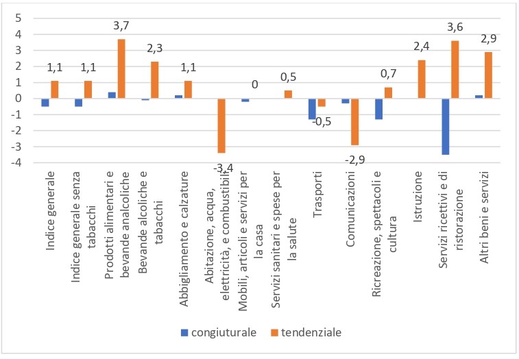 Crescono tendenzialmente rispetto all’anno precedente prodotti alimentari e bevande analcoliche (+3,7%), bevande alcoliche e tabacchi (2,3%), abbigliamento e calzature (1,1%), servizi sanitari e spese per la salute (+0,5%), ricreazione, spettacoli e cultura (+0,7%), istruzione (+2,4%), servizi ricettivi e ristorazione (+3,6%) e altri beni e servizi (+2,9%). Decrescono tendenzialmente rispetto all’anno precedente abitazione, acqua, elettricità e combustibili (-3,4%), trasporti (-0,5%) e le comunicazioni (-2,9%). Non subiscono alcuna variazione tendenziale mobili, articoli e servizi per la casa.