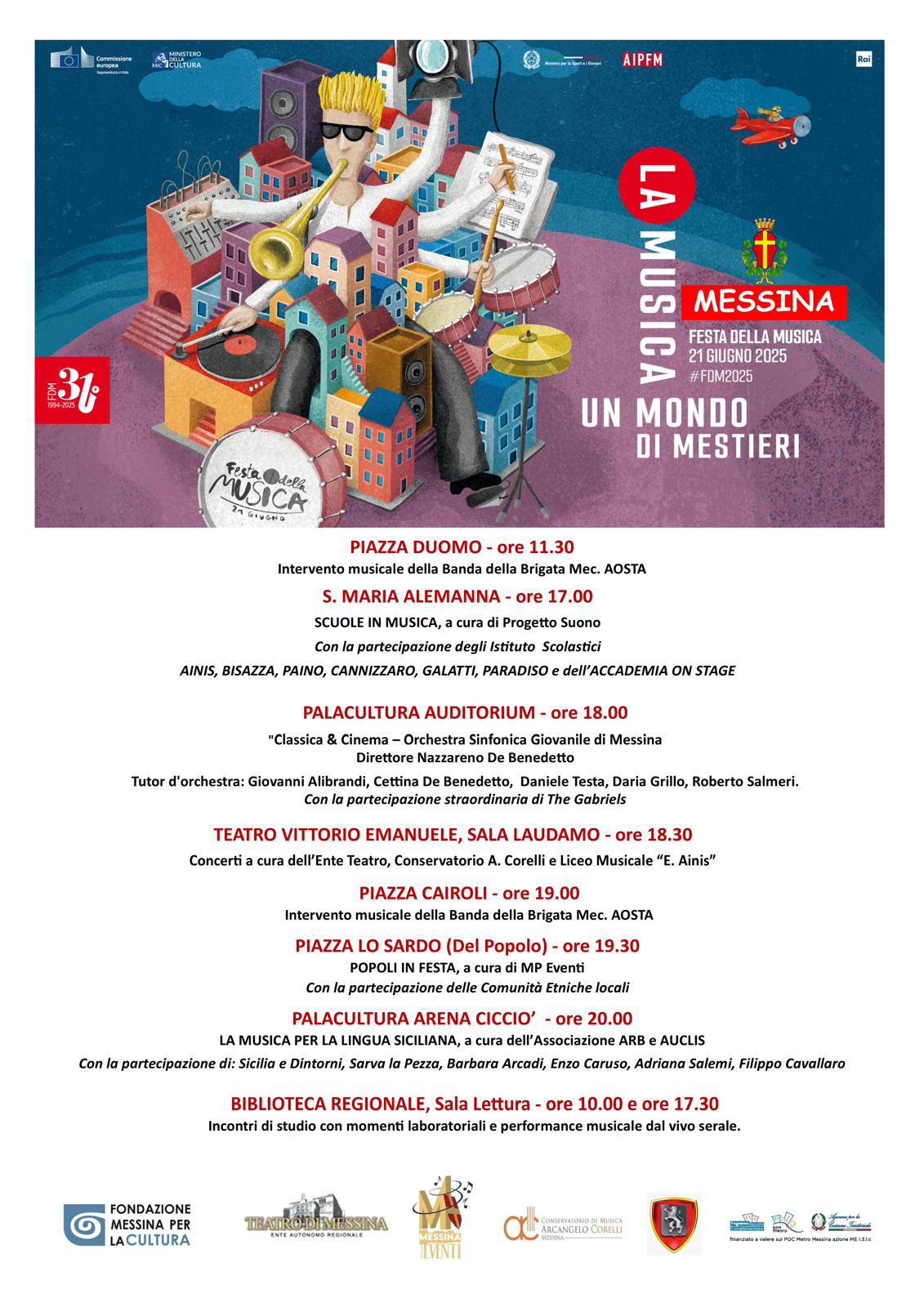 Anche quest’anno l’Amministrazione comunale ha iscritto la città di Messina tra i comuni italiani che propongono a livello locale la “Festa Italiana della Musica”, edizione 2025. L'evento, co-organizzato dal Comune di Messina e dalla Fondazione Messina per la Cultura, insieme al Teatro di Messina ente autonomo regionale, al Conservatorio A. Corelli, alla Brigata Meccanizzata AOSTA, alla Biblioteca Regionale ed alcune associazioni proponenti, si svolge sabato 21 giugno, per festeggiare con la musica il solstizio d'estate. Obiettivo della Festa della Musica è diffondere i valori della musica e le esibizioni degli artisti rese, per principio, all'insegna della gratuità.