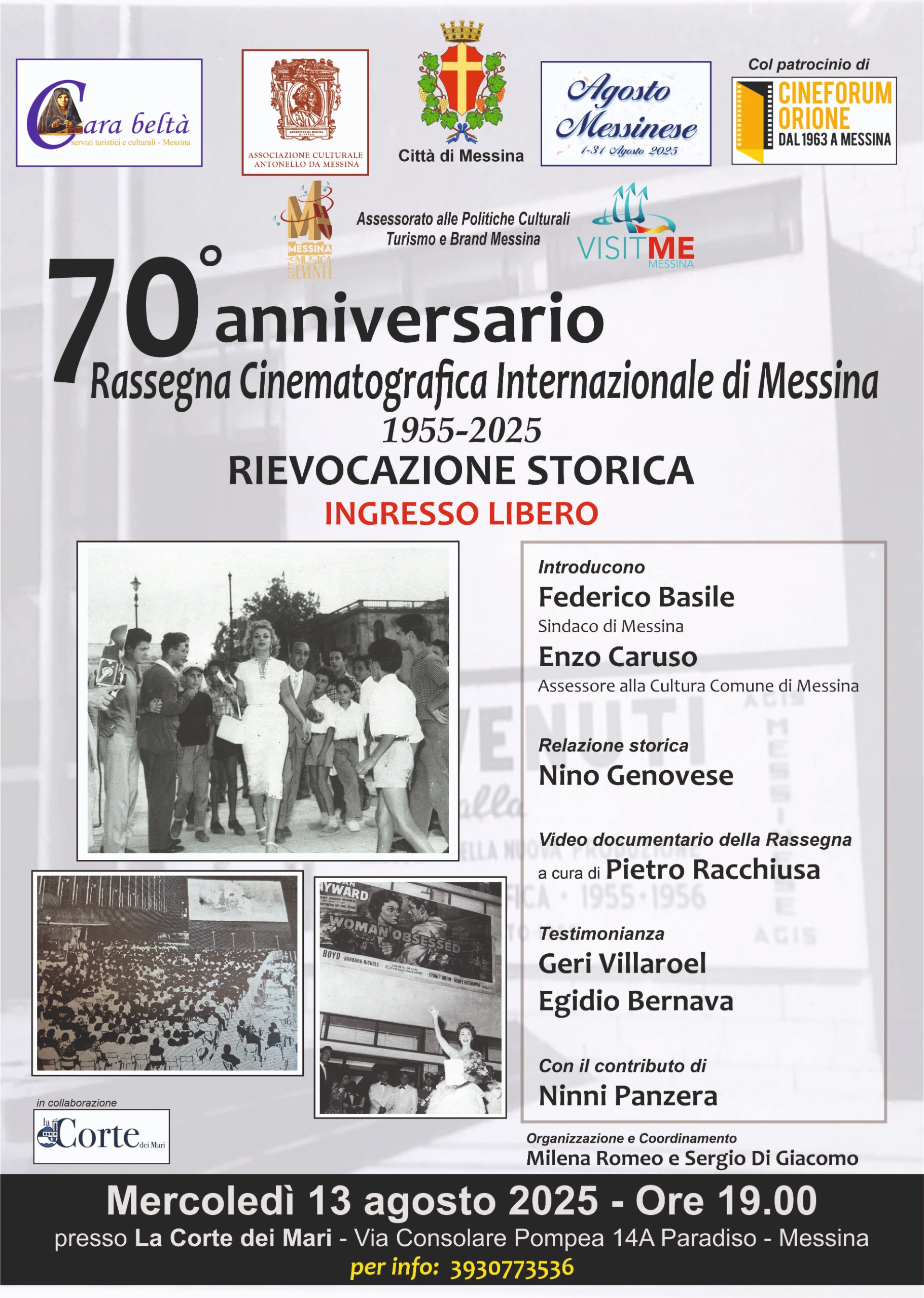 Domani, mercoledì 13, alle ore 7.30, trasferimento dei Giganti da Camaro a Piazza Unione Europea. Dalle 17 sino alle 19, visite guidate al Museo Vara e Giganti, a cura dei volontari del SCU della Biblioteca comunale. Alle 19, presso la Corte dei Mari, in via Consolare Pompea, serata amarcord, "Messina l'Irrera a Mare e la Rassegna Cinematografica", promossa dall'Associazione Antonello da Messina, presieduta da Milena Romeo, in sinergia con l'Assessorato alle Politiche Culturali, in occasione del 70° anniversario della Rassegna Cinematografica Internazionale di Messina (1955-2025). Ingresso libero per la rievocazione storica. Introduzione del Sindaco Federico Basile e dell'Assessore alle Politiche Culturali Enzo Caruso, relazione storica di Nino Genovese, video documentario della Rassegna a cura di Pietro Racchiusa, testimonianze Geri Villaroel ed Egidio Bernava, con il contributo di Ninni Panzera. Organizzazione e coordinamento di Milena Romeo e Sergio Di Giacomo. Per info 393-0773536. Sempre domani, alle 21.30, nella Scalinata di Palazzo Zanca, "Folk in Fest sotto i Giganti", a cura dei gruppi folklorici di Messina.