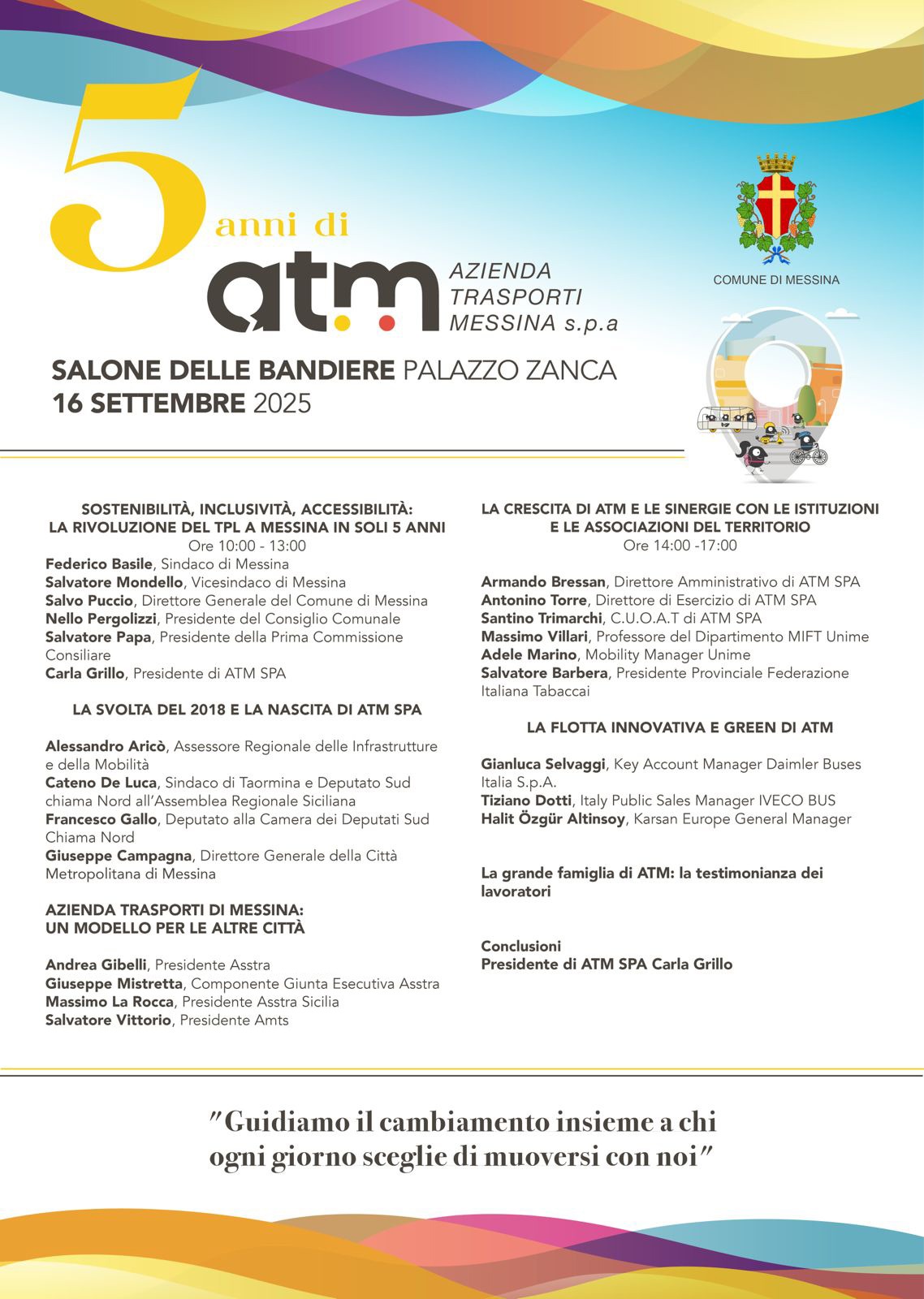 "Il 17 settembre - continua la Presidente - sarà la volta dell’evento 'Connessioni in movimento', che si terrà a Villa Dante e rappresenterà un’occasione per affrontare tematiche particolarmente care all’Azienda Trasporti, quali sostenibilità, sicurezza stradale e contrasto alla violenza di genere. Parteciperanno l’Assessora alle Politiche Sociali Alessandra Calafiore; l’Assessora alle Politiche Giovanili e alle Pari Opportunità Liana Cannata; le associazioni AlbaViva, Associazione Italiana Vittime della Strada, Cedav, Cirs, Evaluna, Posto Occupato, Uisp, Fiab e Crescendo Incubatore. All’evento saranno inoltre presenti il motovlogger Helios Gentile e gli Istituti scolastici Iaci e Verona Trento. Sempre il 17 settembre a Villa Dante, alle ore 15, è stato organizzato un tavolo tecnico dal titolo “Sicurezza a bordo: misure efficaci per il trasporto pubblico”, al quale prenderanno parte l’Assessora Cannata; la Presidente di Messina Social City Valeria Asquini; Federica Maria Raiti, vice-presidente di Road to 50%; e la presidente della Consulta Giovanile del Comune di Messina, Aurora Falcone".