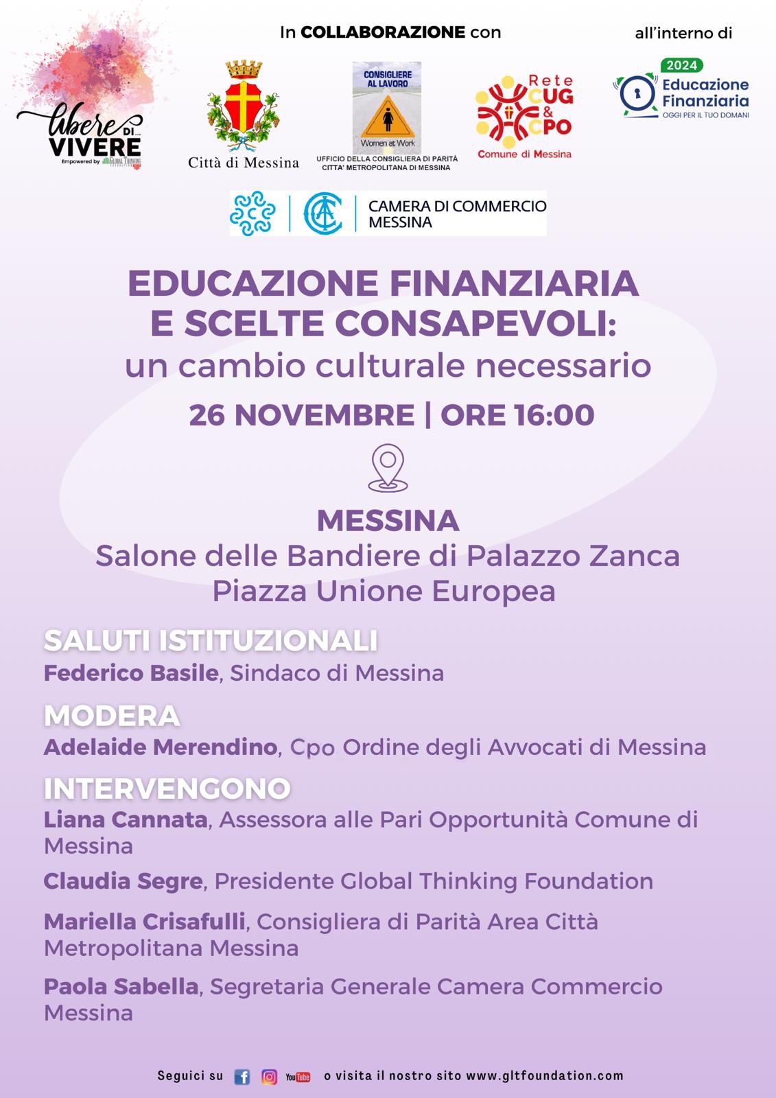 Martedì 26 novembre, nel salone delle Bandiere a palazzo Zanca, a partire dalle ore 16, si terrà un importante convegno dedicato all'educazione finanziaria, dal titolo "Educazione Finanziaria e Scelte Consapevoli: un cambio culturale necessario", promosso dall'assessora alle Pari Opportunità Liana Cannata, insieme a Claudia Segre, presidente della Global Thinking Foundation, al fine di sensibilizzare il pubblico, e in particolare le donne, sull'importanza di acquisire solide competenze finanziarie per una gestione economica più consapevole della propria vita. In apertura dell'incontro i saluti istituzionali del sindaco Federico Basile.
