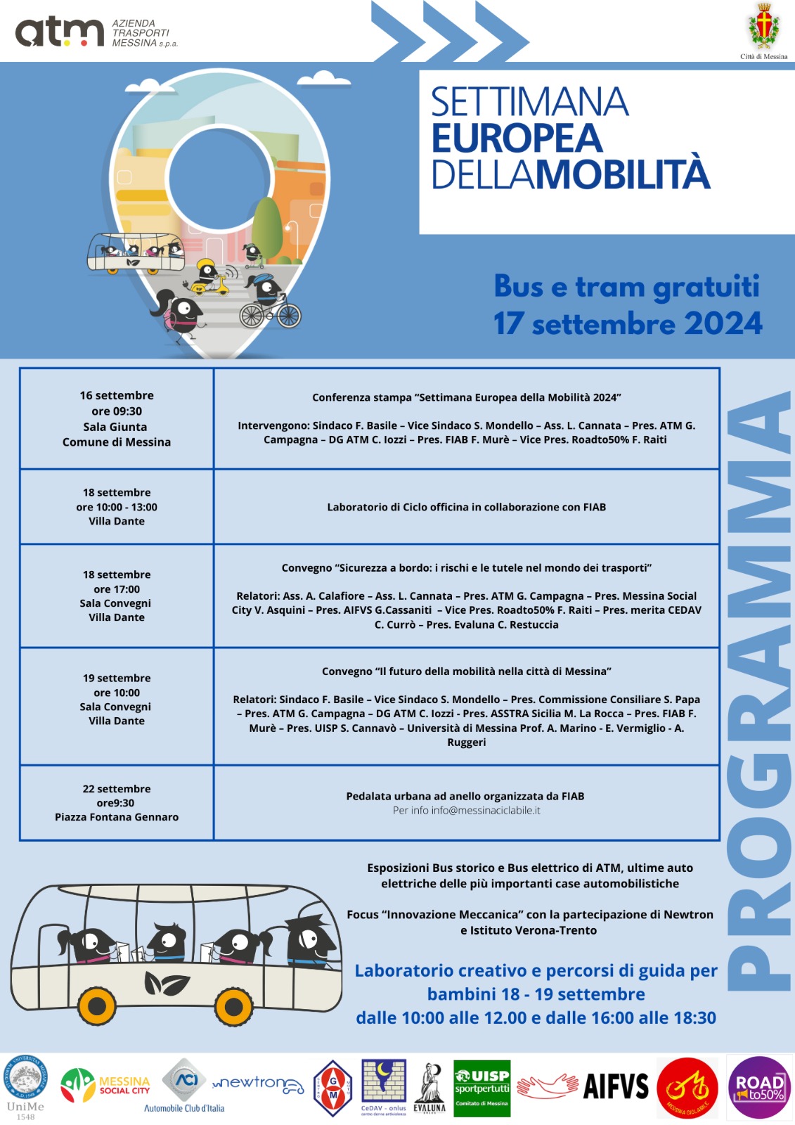 Il presidente di Atm Spa, Giuseppe Campagna, ha sottolineato che “In questi anni ATM è diventata un'azienda leader in tema di mobilità sostenibile: la flotta elettrica dell’Azienda Trasporti di Messina è pari al doppio di quella delle altre città italiane e diventerà certamente la prima, quando arriveranno i bus elettrici già acquistati e in consegna tra la fine del 2024 e nel corso del 2025. A proposito della Settimana Europea della Mobilità ha aggiunto: “Torniamo con la terza edizione e posso affermare che ogni appuntamento ha fotografato la situazione attuale del trasporto pubblico locale. Nella prima edizione avevamo l'esigenza di far sapere che finalmente c'erano gli autobus in città e che i cittadini potevano iniziare ad utilizzare i mezzi pubblici; nella seconda edizione abbiamo approfondito gli aspetti tecnici e tecnologici del trasporto pubblico locale con un focus specifico sull’impiego di mezzi elettrici a idrogeno e uno sguardo al futuro; in questa terza affronteremo le tematiche relative alla sicurezza, sia con interessanti convegni sia aderendo alla campagna 'Mezzi per tutte', in collaborazione con l’assessorato alle Pari opportunità, diretto dall’assessora Cannata e in sinergia con la Messina Social City”.