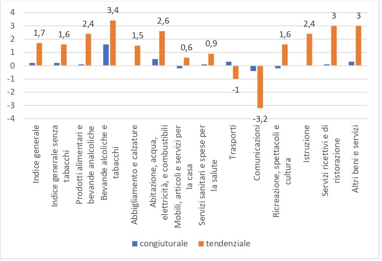 Prodotti per fumatori: a causa dell’aumento di accisa, Iva e aggio, si riscontra un aumento congiunturale e tendenziale di tutti i tabacchi. L’incremento maggiore è registrato dalle sigarette (+3,1%; +4,9% il tendenziale), seguite da altri tabacchi (+0,6%; +1,8% il tendenziale) e da sigari e sigaretti (+0,2%; +1,6% il tendenziale). Aumentano anche gli articoli per fumatori (+1,1%), dovuto all’aumento di alcuni prodotti per fumatori.