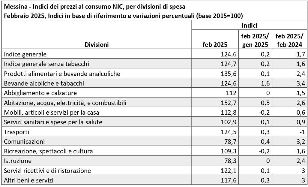 Nel mese di febbraio 2025, a seguito della rilevazione dei prezzi al consumo per l’intera collettività (NIC), effettuata dall’ufficio Statistica del Comune di Messina, l'indice complessivo della città ha registrato un incremento tendenziale del 1,7% e congiunturale dello 0,2% dell’indice dei prezzi al consumo.
