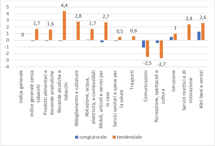 Prodotti per fumatori: si riscontra un aumento congiunturale di sigari e sigarette (+0,1%; +2,2% il tendenziale), a causa dell’aumento di alcune marche di sigari.