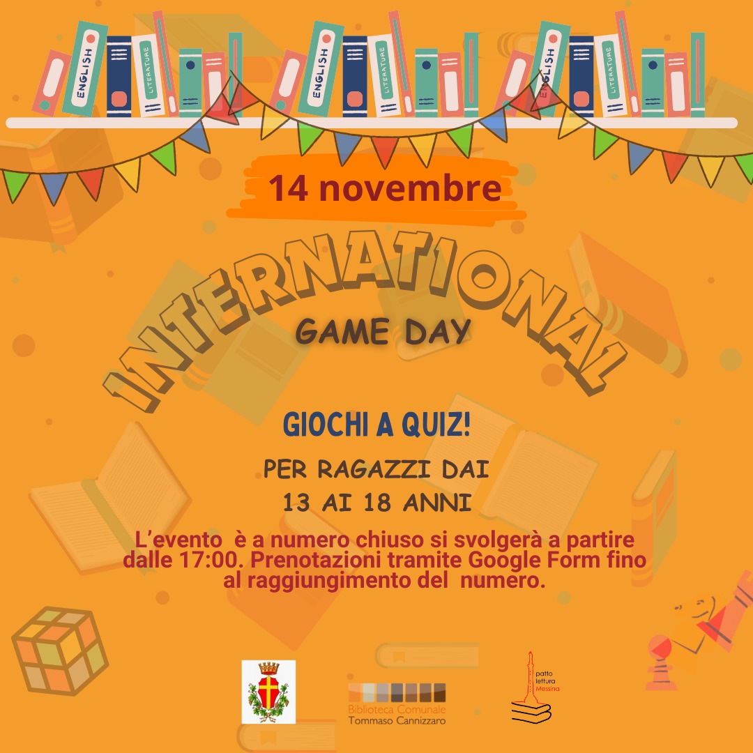 Anche quest’anno la Biblioteca comunale "Cannizzaro" ha aderito all’International Game Month con la collaborazione dei volontari del servizio Civile Nazionale. L'evento, che prevede giochi a quiz e caccia al tesoro in Biblioteca, si svolgerà giovedì 14 novembre, a partire dalle ore 17, con una durata di circa un'ora e trenta. La prenotazione obbligatoria, per i ragazzi dai 13 sino ai 18 anni, si può effettuare, con un massimo di 16 partecipanti, tramite Google Form al seguente link https://forms.gle/128F2CYsdZVcaWRK6 fino ad esaurimento dei posti.