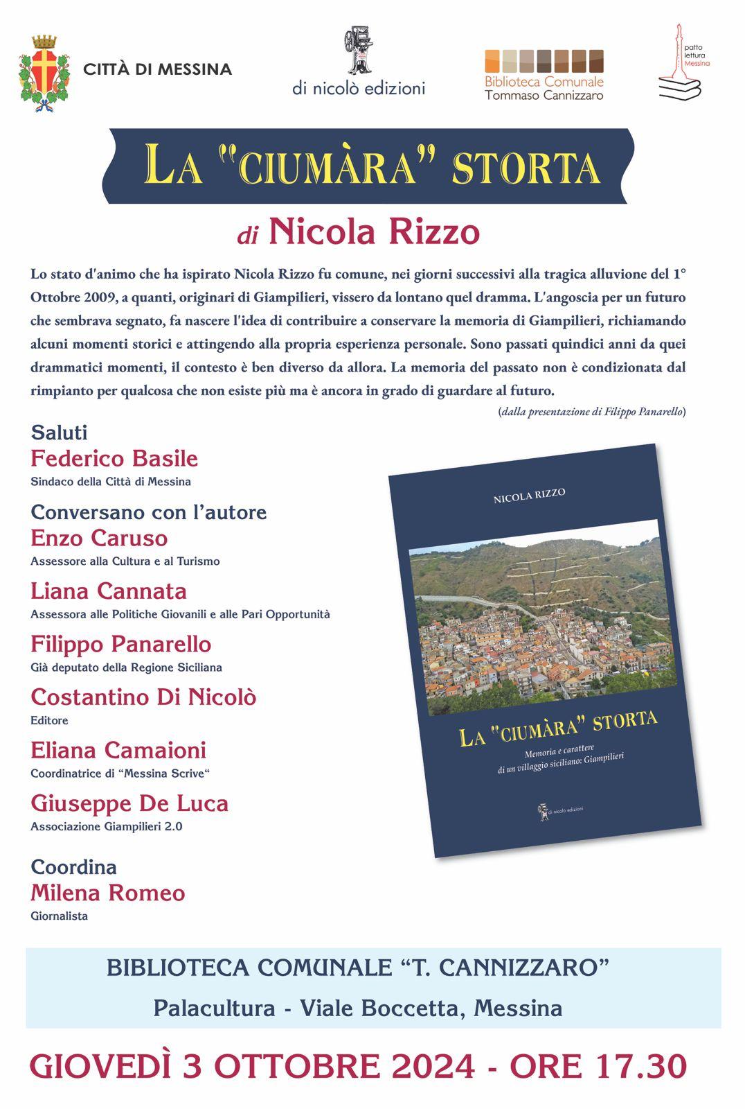 Domani, giovedì 3 ottobre, alle ore 17.30, presso la Biblioteca comunale “Cannizzaro”, al Palacultura Antonello, presenti il sindaco Federico Basile e gli assessori Enzo Caruso e Liana Cannata, sarà presentato il libro La “Ciumàra” Storta – Memoria e carattere di un villaggio siciliano, scritto da Nicola Rizzo, edizioni Di Nicolò. L’evento, patrocinato dal comune di Messina, si inserisce in occasione del quindicesimo anniversario dell’alluvione di Giampieri. Rizzo, docente universitario, professore ordinario di Ginecologia e Ostetricia presso l’Alma Mater di Bologna, originario di Giampilieri, paese con cui ha sempre conservato uno stretto legame, ha scritto un volume che rappresenta un atto d’amore verso la propria terra, le proprie radici, la propria storia. Alla presentazione del libro parteciperanno anche Filippo Panarello prefattore del volume, l’editore Costantino Di Nicolò, la giornalista Milena Romeo, il referente dell’associazione Giampilieri 2.0 Giuseppe De Luca, la coordinatrice di Messina scrive Eliana Camaioni.