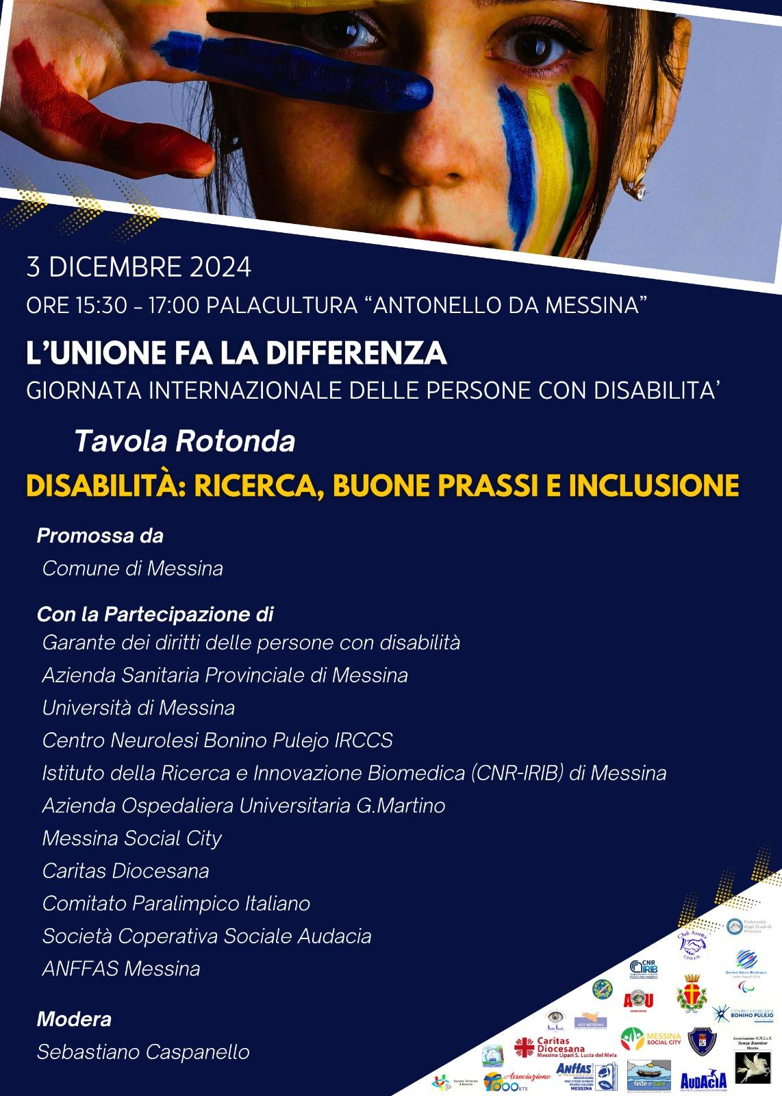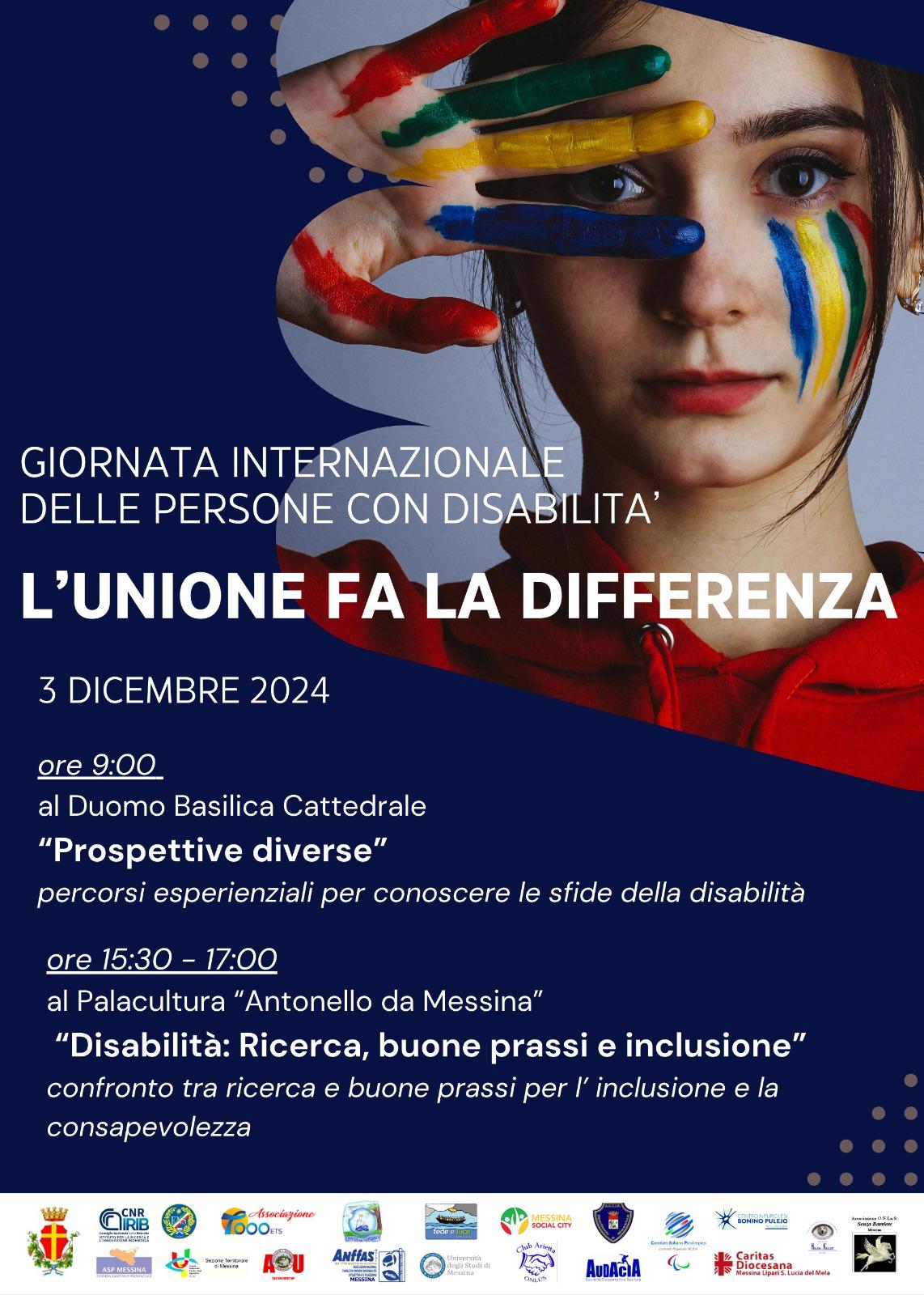 L’Amministrazione comunale di Messina, insieme a Messina Social City, Asp, l'Università degli Studi di Messina, l'IRCSS, il CNR Irib, l'Azienda Ospedaliera Gaetano Martino, l'ente nazionale Sordi, l'Unione Italiana Ciechi, il centro regionale Hellen Keller, la Caritas Diocesana, il Comitato Paralimpico Italiano, l'Anfas, l'associazione Il Volo, la società cooperativa Audacia, in occasione della “Giornata Internazionale Diritti della Persona con Disabilità”, prevista domani, martedì 3 dicembre, ha organizzato delle attività di promozione e sensibilizzazione su questa importante tematica nell’iniziativa “L’Unione fa la Differenza”.