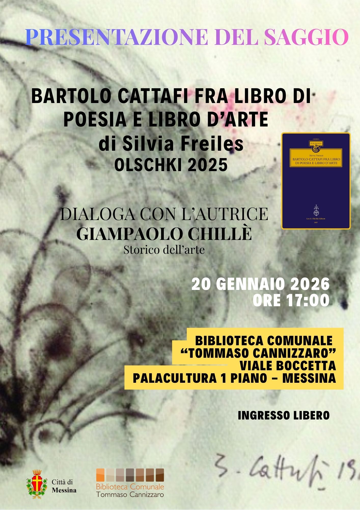 Martedì 20 gennaio, alle ore 17, presso la Biblioteca comunale "Tommaso Cannizzaro", al 1° piano del Palacultura Antonello, si svolgerà la presentazione del saggio "Bartolo Cattafi fra libro di poesia e libro d'arte" di Silvia Freiles (Olschki 2025), dedicato a Cattafi, poeta originario di Barcellona Pozzo di Gotto. Dotato di straordinaria complessità intellettuale, Cattafi rappresenta una delle voci più autentiche del secondo Novecento, capace di muoversi tra le forme artistiche che vanno dalla poesia alla pittura, dal disegno alla fotografia.