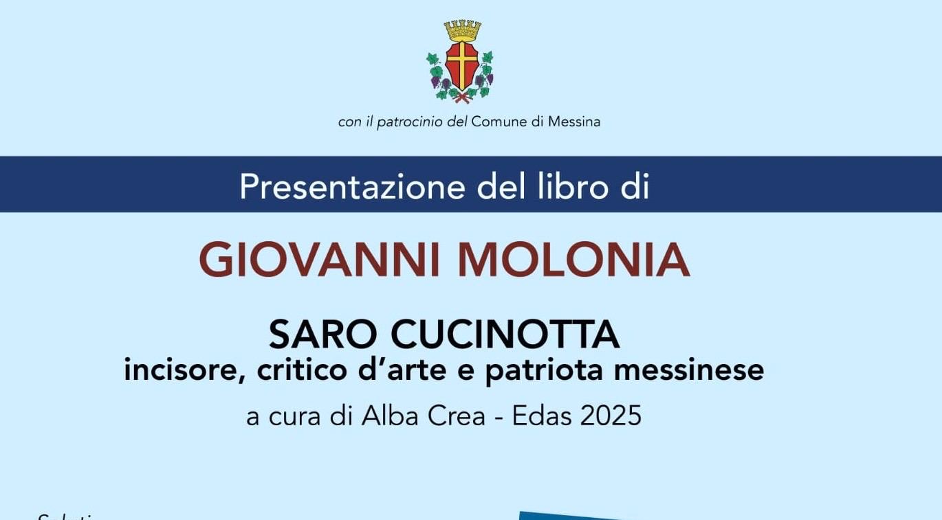 Oggi, martedì 18 febbraio, alle ore 17, nella sala Palumbo del Palacultura Antonello, si terrà la presentazione del libro "Saro Cucinotta, incisore, critico d'arte e patriota messinese". All'evento, patrocinato dal Comune di Messina, porterà i saluti l'assessore Enzo Caruso, anche nel suo ruolo di studioso di storia patria. Il libro su Saro Cucinotta del compianto Giovanni Molonia, ricco di immagini e notizie inedite, sarà presentato dagli storici dell’arte Gioacchino Barbera, già direttore della Galleria Regionale di palazzo Abatellis di Palermo, e Luigi Giacobbe della Soprintendenza per i Beni Culturali e Ambientali di Messina. Interverranno anche Giovanna Quartarone dell'Archivio storico e della Biblioteca comunale, Alba Crea curatrice dell’opera e l'editrice Mimma Vicidomini. Nell’occasione sarà letta una presentazione al volume a firma di Mariantonietta Picone Petrusa, professore emerito di Storia dell’arte dell’Università di Napoli.