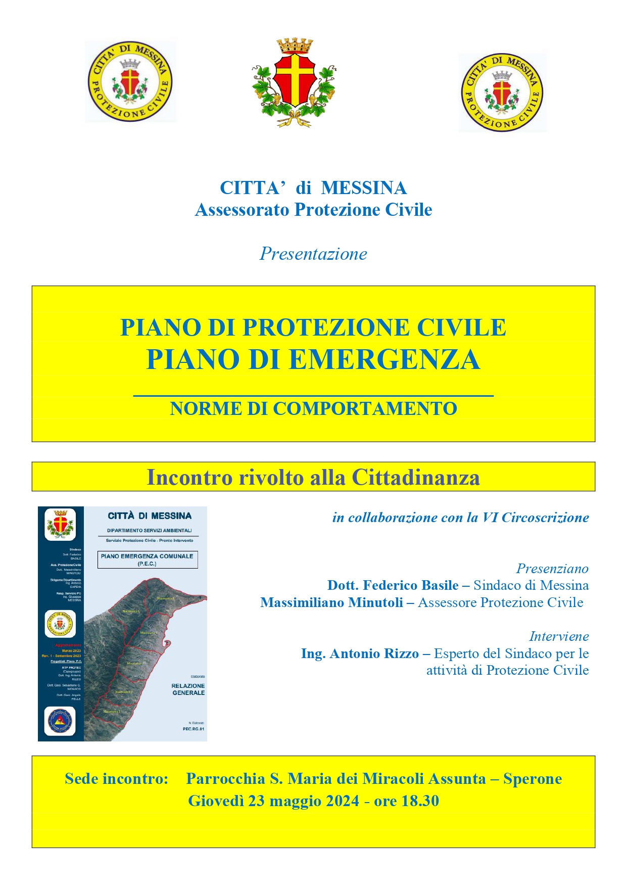 Proseguono gli incontri per la presentazione del nuovo Piano comunale di Protezione civile. Giovedì 23 maggio, alle ore 18.30, presenti il sindaco Federico Basile e l'assessore con delega alla Protezione civile Massimiliano Minutoli, si terrà un confronto con la cittadinanza alla parrocchia Santa Maria dei Miracoli Assunta a Sperone, dopo i precedenti appuntamenti alla scuola media La Pira a Camaro, all'Hotel Royal con il Rotary Messina Peloro, alla parrocchia Santissima Maria Assunta a Faro Superiore e in quella di San Nicola di Bari a Ganzirri. Alla riunione parteciperà l'esperto del Sindaco per le attività di protezione civile Antonio Rizzo.