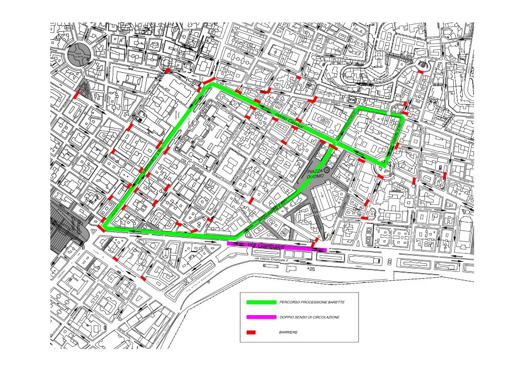 Dalle 16 sino al termine della processione, saranno istituiti i divieti di transito e le direzioni obbligatorie a destra di via Peculio Frumentario, all’intersezione con via San Giovanni Bosco; a sinistra sul corso Cavour all’intersezione con via San Camillo/via della Munizione; a destra in via Cesare Battisti all’intersezione con via Maddalena; a sinistra in via Cesare Battisti all’intersezione con via Nicola Fabrizi; e a sinistra in via Romagnosi all’intersezione con via San Cristoforo. Sempre oggi, dalle 16 per il tempo necessario al passaggio del corteo della processione delle Barette, sarà anche vietato il transito nella carreggiata ovest di via Garibaldi, tra largo San Giacomo e via I Settembre, e vigerà il doppio senso di circolazione nella carreggiata est di via Garibaldi tra largo S. Giacomo e via I Settembre.