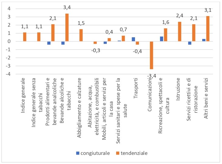 Servizi di trasporto: Nel trasporto si registra un aumento congiunturale generalizzato dei prezzi dovuto alle festività natalizie. In particolare, nel trasporto aereo l’aumento maggiore si rileva nei voli intercontinentali (+41,7%; +13,2% il tendenziale), seguiti da quelli nazionali (+21,6%; -5,4% il tendenziale) e da quelli europei (+5,1%; +6,6% il tendenziale). Per quanto riguarda i voli intercontinentali, gli aumenti si riscontrano su tutte le tratte, in particolare su quelle verso i Paesi americani. Per quanto riguarda i voli nazionali ed europei, all’aumento congiunturale contribuiscono sia i vettori tradizionali che quelli low cost, con variazioni maggiori per questi ultimi. Si rileva, inoltre, un leggero aumento dei prezzi dei trasporti ferroviari nazionali (+0,1%; +1,9% il tendenziale). Si registra infine un aumento del trasporto marittimo (+3,2%; +12,0% il tendenziale), che interessa sia le destinazioni verso l’estero che soprattutto quelle verso l’interno, in particolare verso le isole maggiori.