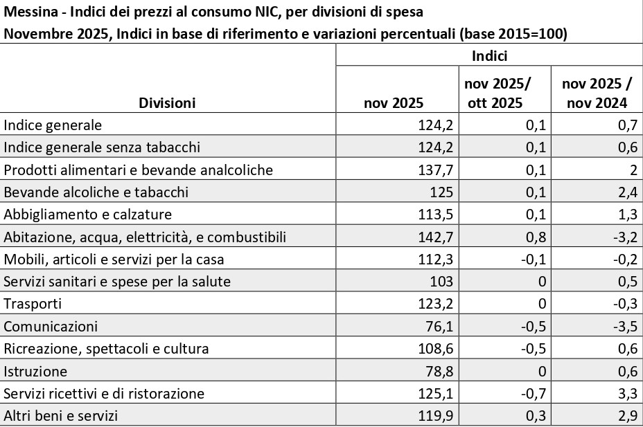 Nel mese di novembre 2025, a seguito della rilevazione dei prezzi al consumo per l’intera collettività (NIC), effettuata dall’ufficio Statistica del Comune di Messina, l'indice complessivo della città ha registrato un incremento tendenziale dello 0,7% e un incremento congiunturale dello 0,1% dell’indice dei prezzi al consumo.