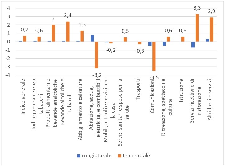 Crescono tendenzialmente rispetto all’anno precedente prodotti alimentari e bevande analcoliche (+2%), bevande alcoliche e tabacchi (2,4%), abbigliamento e calzature (1,3%), servizi sanitari e spese per la salute (+0,5%), ricreazione, spettacoli e cultura (+0,6%), istruzione (+0,6%), servizi ricettivi e ristorazione (+3,3%) e altri beni e servizi (+2,9%). Decrescono tendenzialmente rispetto all’anno precedente abitazione, acqua, elettricità e combustibili (-3,2%), mobili, articoli e servizi per la casa (-0,2%), trasporti (-0,3%) e le comunicazioni (-3,5%).