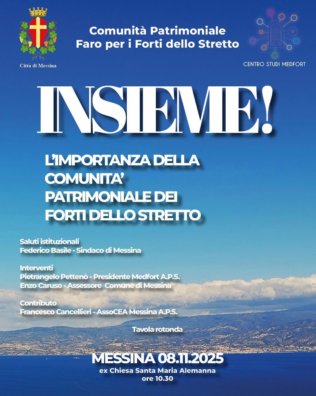 Nell'ambito della seconda edizione della kermesse "Forti d'Autunno", promossa dall'Amministrazione comunale, domani, sabato 8 novembre, a Santa Maria Alemanna, a partire dalle ore 10.30, il programma prevede, in apertura, la conferenza di inaugurazione, aperta alla stampa, dal tema "INSIEME - L'importanza della Comunità Patrimoniale dei Forti dello Stretto di Messina", con i saluti istituzionali del Sindaco Federico Basile, gli interventi dell'Assessore alla Valorizzazione e alla Promozione del Patrimonio Fortificato di Messina Enzo Caruso e del Presidente Medfort A.P.S. Pietrangelo Pettenò e il contributo dell'ing. Francesco Cancellieri di AssoCea Messina A.P.S..
