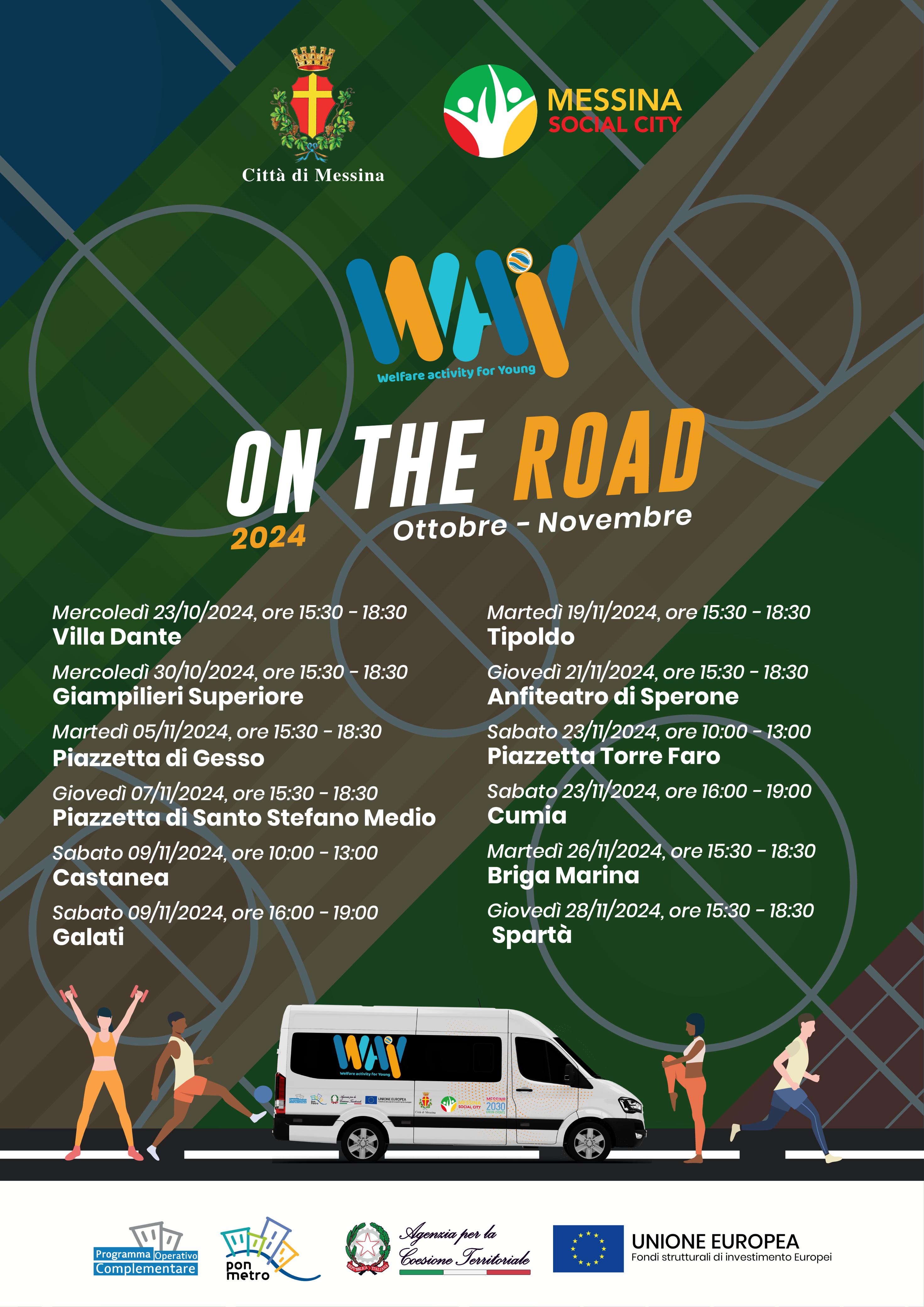 La Messina Social City, in collaborazione con il Comune di Messina, prosegue il suo impegno per la promozione del progetto "WAY – Welfare Activity for Young", volto a favorire l’inclusione sociale attraverso lo sport. Dopo mesi di attività rivolte ai giovani, in particolare agli under 29 con o senza disabilità, nasce "WAY on the ROAD", una serie di eventi itineranti che raggiungeranno direttamente le comunità locali delle sei municipalità di Messina.
